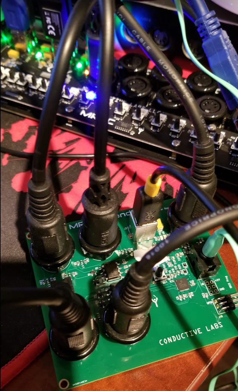 We've just ordered samples of this accessory for testing and want to gauge interest to help us decide how many to make. Its a 4 DIN input and 1 DIN output expander for MRCC. It uses an MRCC USB host port, and each DIN port is automatically connected to the USB host port's 4 ins and 1 out USB virtual MIDI ports. An MRCC can host 4 of these, if you don't mind giving up the USB host ports.