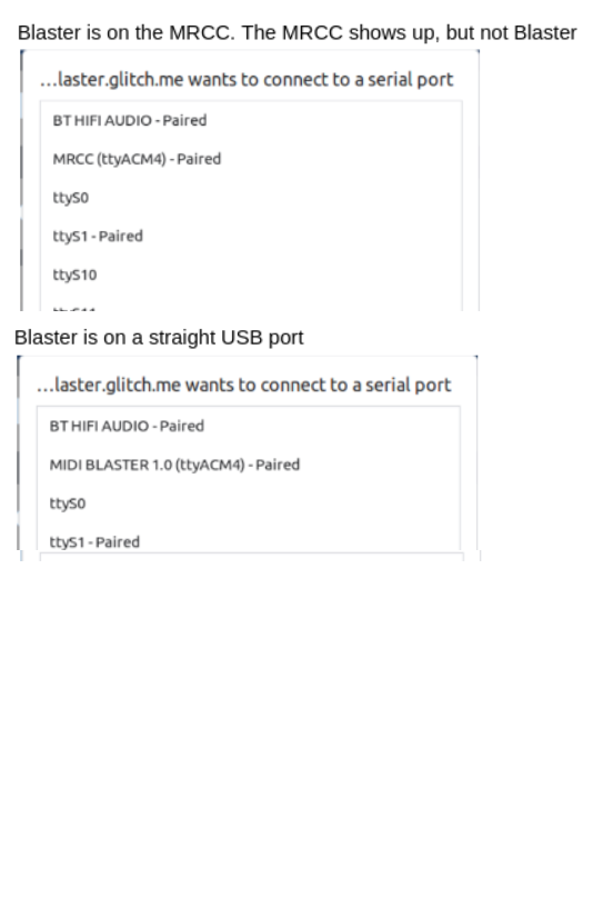 This happens with all of my devices, but for example, if I plug my MIDI Blaster straight to my PC (hub or otherwise) then I can use a PC based manager with it, and Reaper (DAW) is happy, etc. But, if I plug it into the MRCC (DIN, TRS or USB) I can't see it.